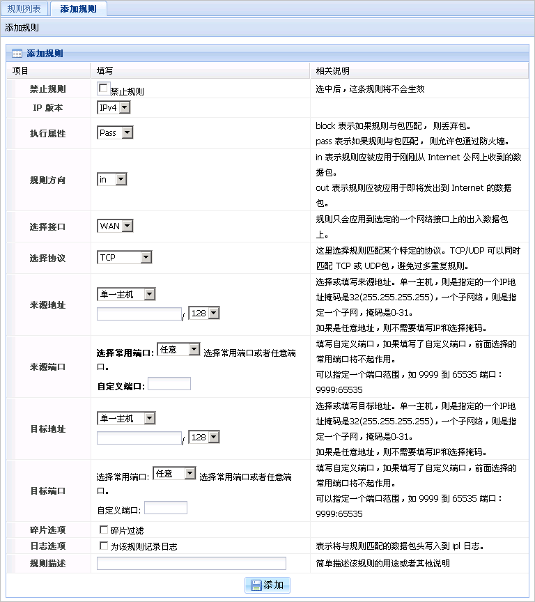 | 选择接口 | 选择规则应用到那个网络接口上的出入数据包上。 | WAN | 选择正确的网络接口。 |