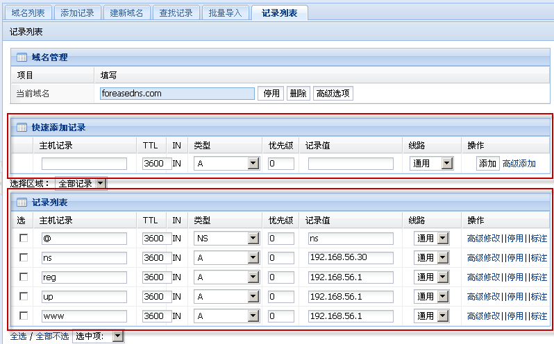 本节主要介绍如何添加记录和修改、删除以及启用、停用记录。有关域名的管理,请阅读第 4.2 节 “ 域名管理”。