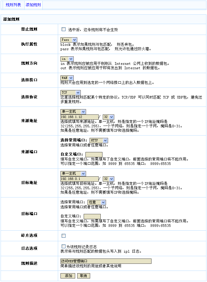 | 选择接口 | 选择规则应用到那个网络接口上的出入数据包上。 | WAN | 选择正确的网络接口。 |